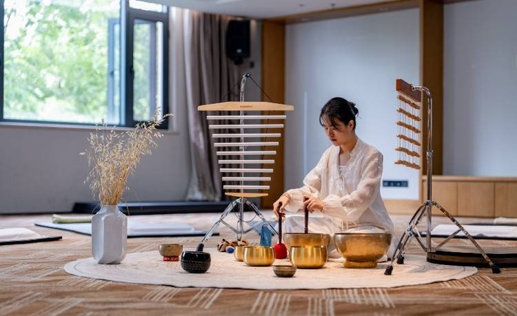 除公益诊疗外,本酒店还围绕“中医药生活化”主题,在酒店内开设系列中医文化特色体验活动:通过音钵疗愈、金刚功早课等特色项目,将《黄帝内经》"治未病"理念融入住宿体验。提供艾灸仪体验、药膳调理等服务,形成"预防-调理-康复"闭环。