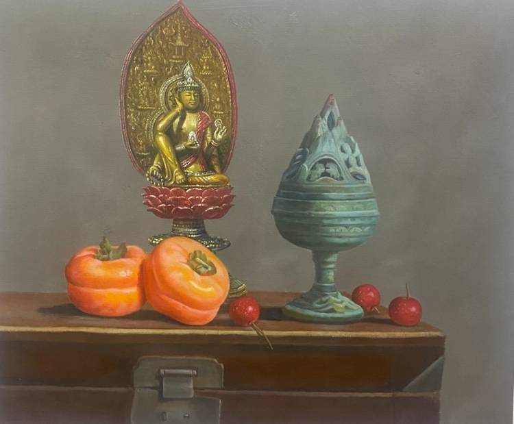 洪阿林先生的参展作品《世世平安有像》成为展览中一道引人驻足的风景。画作匠心独运,以沉稳高雅的色调和精湛的古典写实技法,描绘了一尊古朴的佛菩萨与数枚饱满润泽的柿子。作品在静物写生的基础上,升华出深厚的文化寓意——佛菩萨象征“世世平安”的宏愿,而“柿”与“事”谐音,巧妙点出“事事如意”的吉祥主题。整幅作品通过传统意象与现代油画的融合,传递出对美好生活的深切期许。