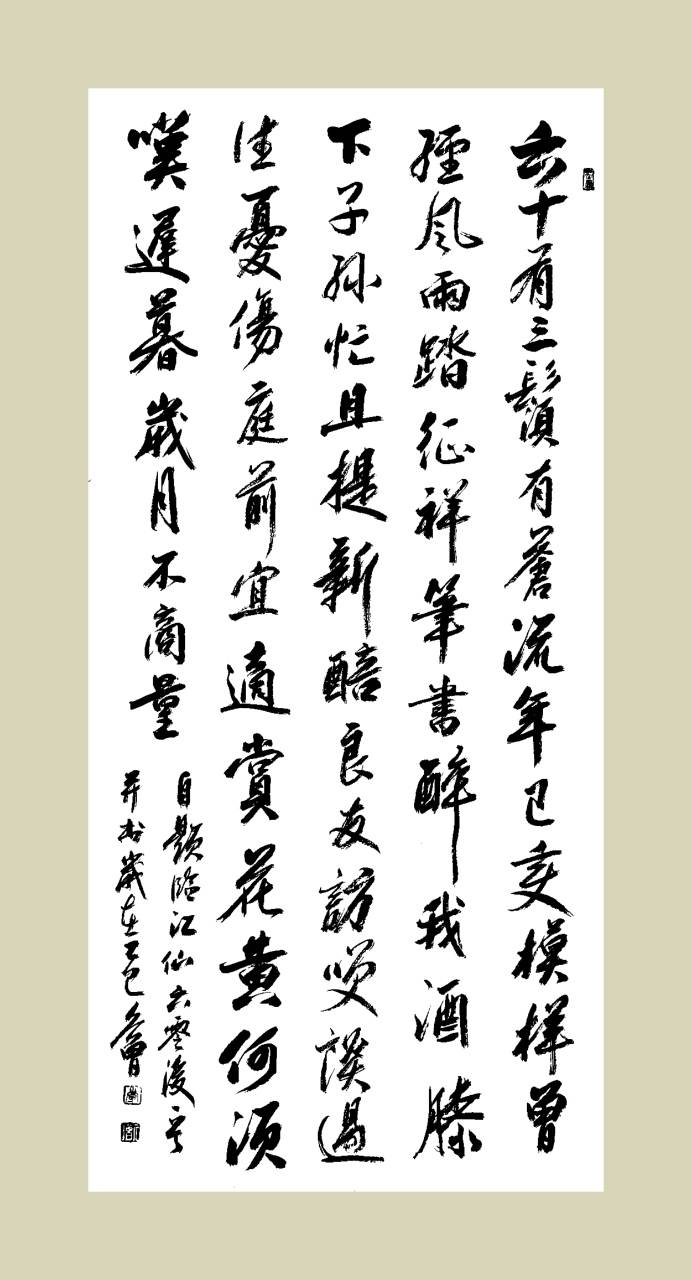 笔者请李老师能否为大家讲授一些行书练习方面应注意些什么,他说:“行书笔法的律动是行书的灵魂,它以提按、顿挫为音符,谱写出节奏与力量的交响。提笔时如轻燕掠水,线条纤细而锐利,仿佛剑锋初露;按笔处似磐石坠地,墨色饱满沉厚,蕴含千钧之力。中锋行笔如苍松挺立,骨力洞达;侧锋取势则似微风摇柳,意趣横生。藏锋处内敛深沉,如智者沉思;露锋时锋芒毕现,似豪情奔涌。这些笔法的流转,不仅是技巧的展示,更是书者心绪的直接投射……”听了李老师一翻精彩论述,笔者陷入沉思,2035年文化复兴是国家发展战略,要是多一些李老师这样的文化传承者,何愁也!