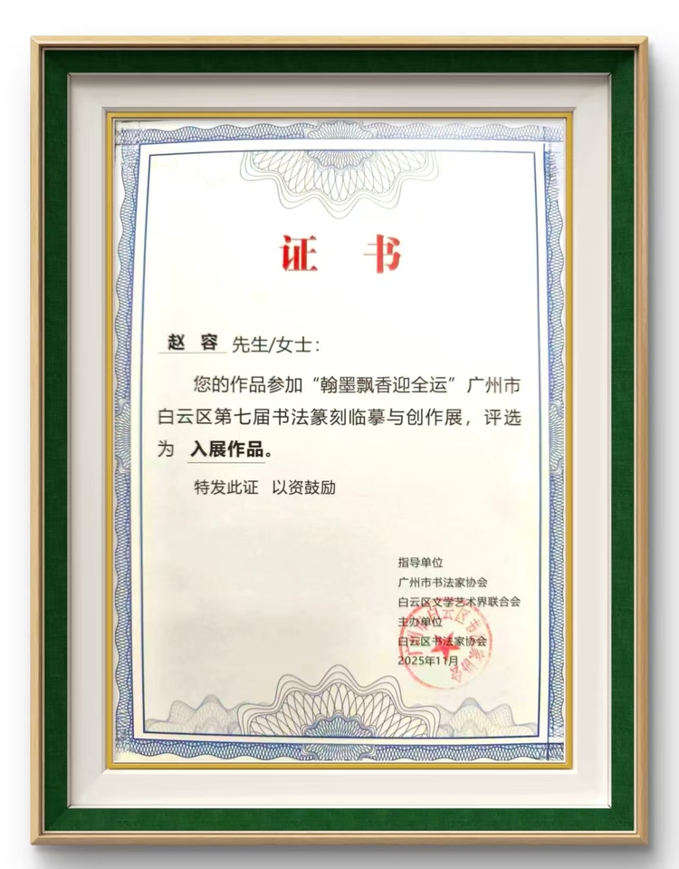2025年11月作品参加由广州市书法家协会主办,白云区文联,白云区书协联合举办的"翰墨飘香迎全运"广州市白云区第七届书法篆刻临摹与创作展,评选为入展作品。