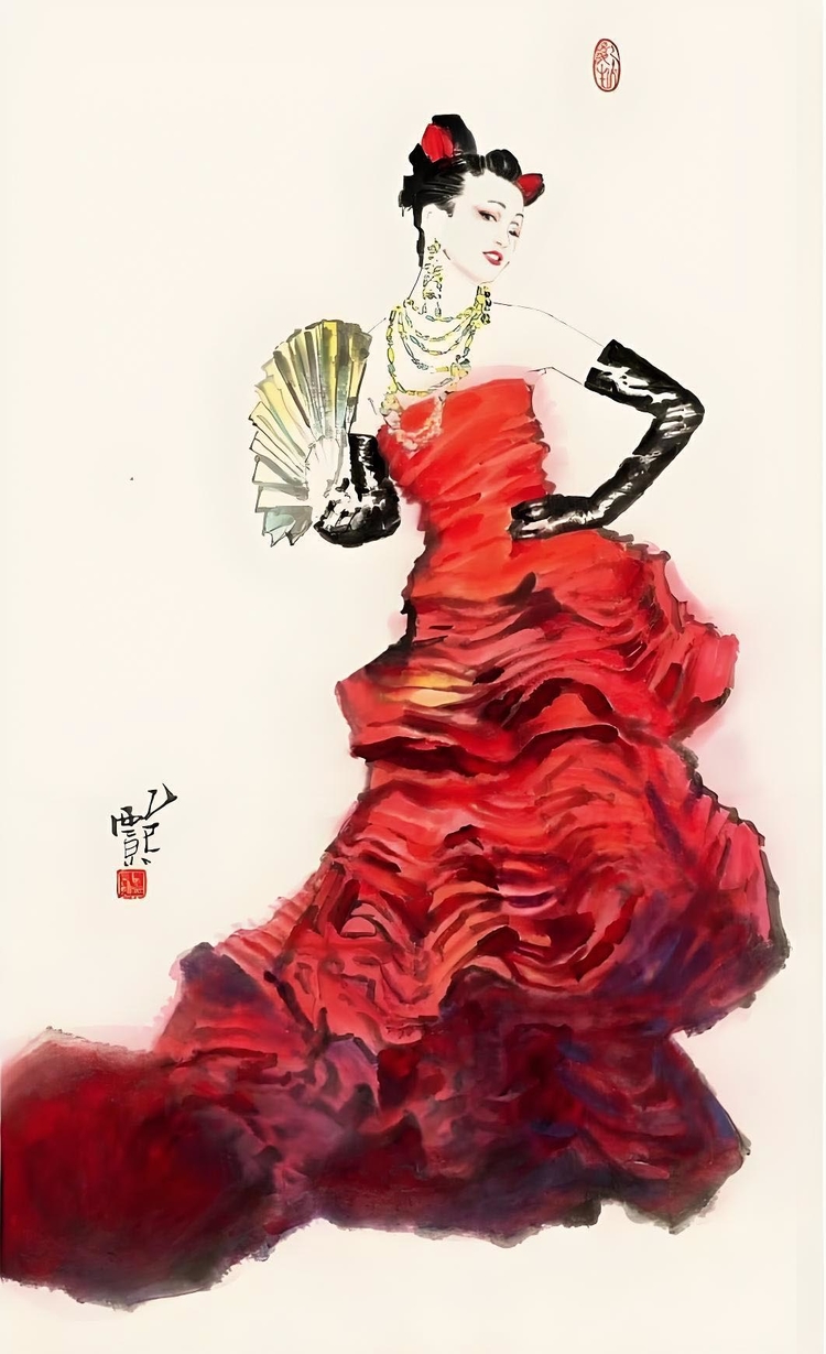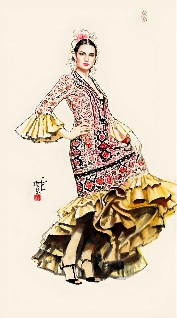 而当王西京的笔触转向欧洲弗拉明戈舞裙(如西班牙服饰作品),以灵动的墨线捕捉裙摆的层叠褶皱,用晕染的淡墨表现丝绸的飘逸,将那热烈奔放的舞蹈气息与服饰的华丽感,通过中国水墨的写意性淋漓尽致地释放出来,解构出服饰文化的魅力。