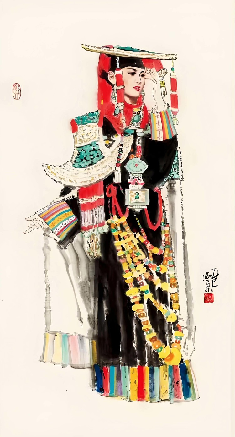 在表现中国少数民族服饰时(如藏族、彝族、苗族服饰作品),他以浓墨重彩勾勒出氆氇织物的厚重质感,用枯笔飞白模拟皮毛的蓬松肌理,那些镶嵌于衣饰间的银饰、彩珠,则以墨色的浓淡对比与朱砂、石青的点染,呈现出金属的冷冽与珠宝的璀璨,让高原的服饰文化在水墨语言中鲜活起来。