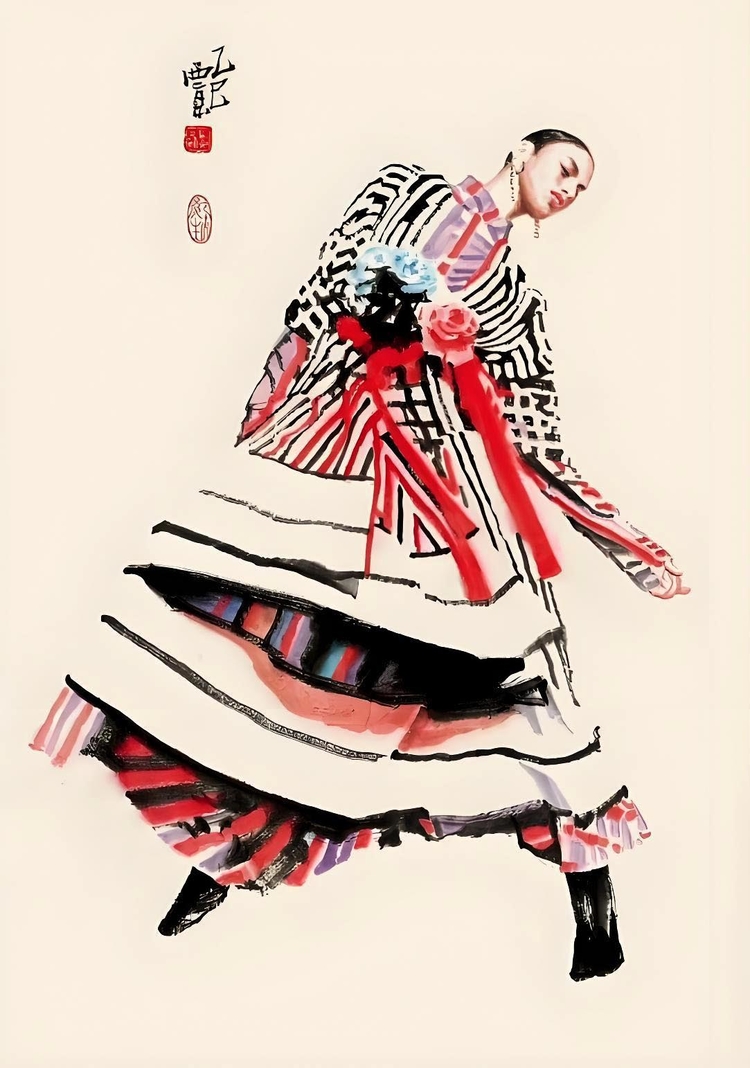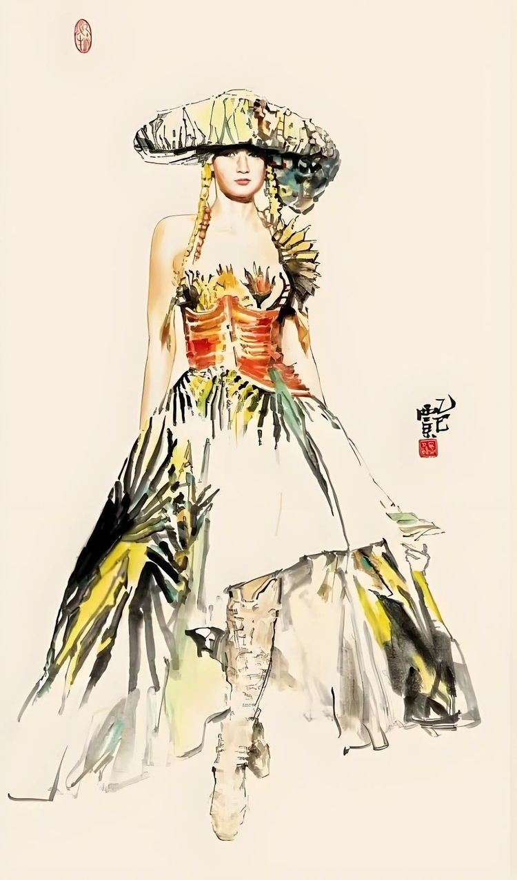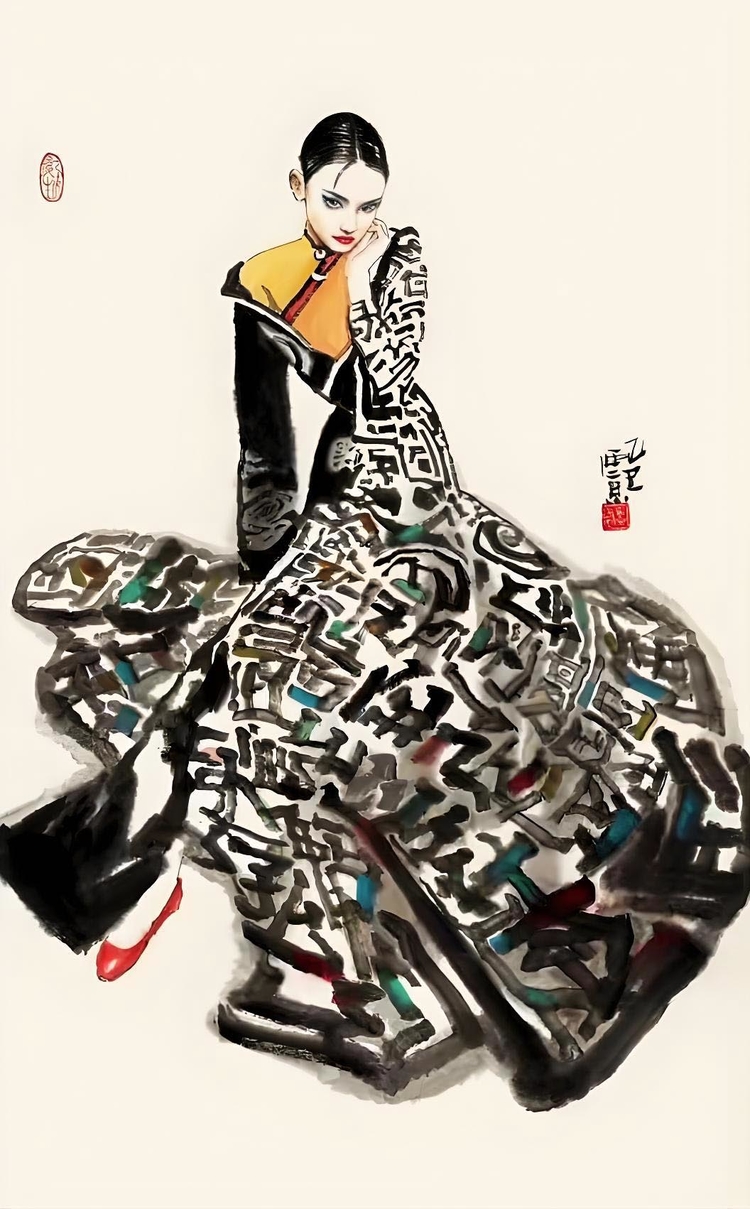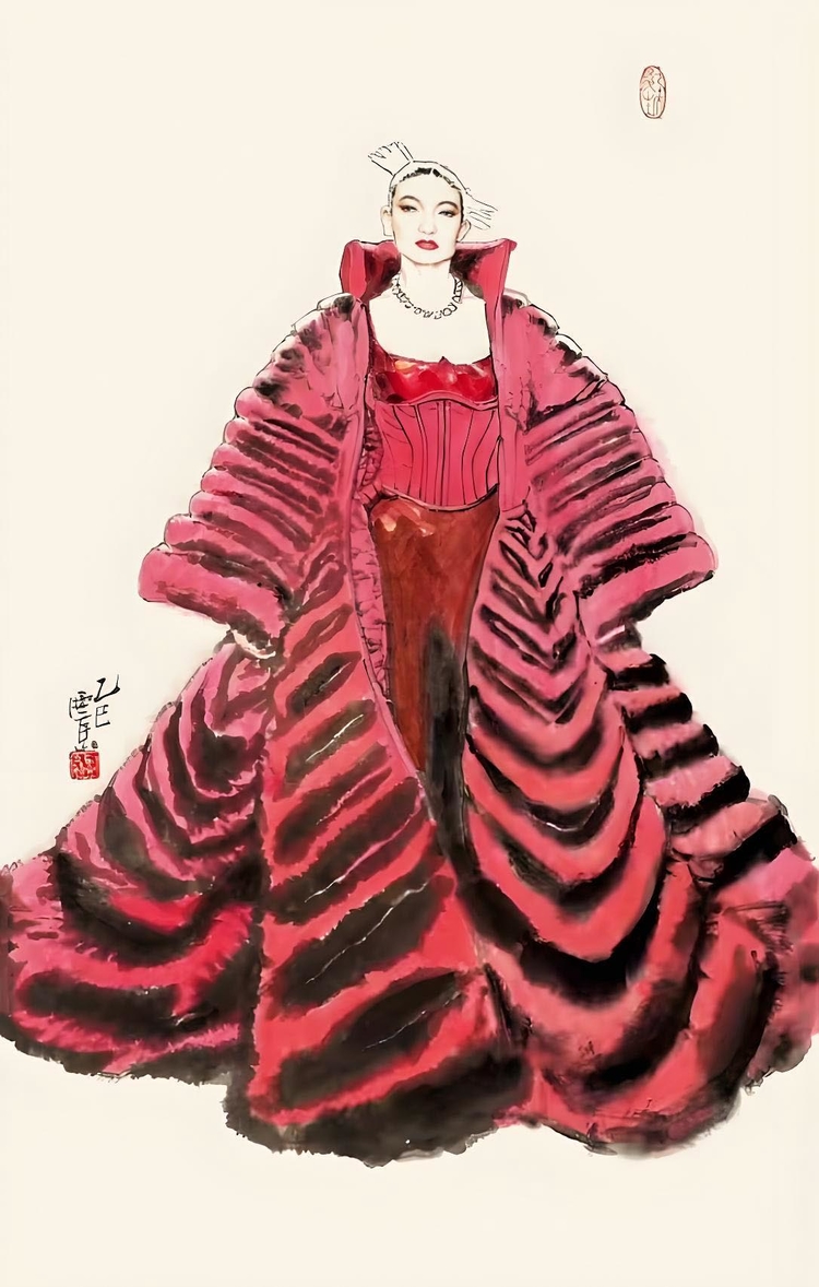 让水墨不再局限于对“人”的精神刻画,更深入到“衣”所承载的文化、时尚与审美维度,使水墨艺术在与服装美学的碰撞中,催生出新的视觉语法与审美体验。