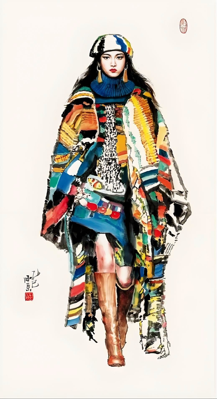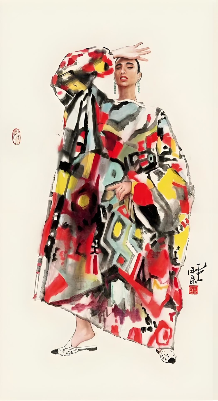 王西京以中国水墨表现现代服饰与民族服饰,是中国水墨之美与服装美学相统一,其意义远超创作本身,更在国际文化传播与艺术创新的维度上实现了双重突围。