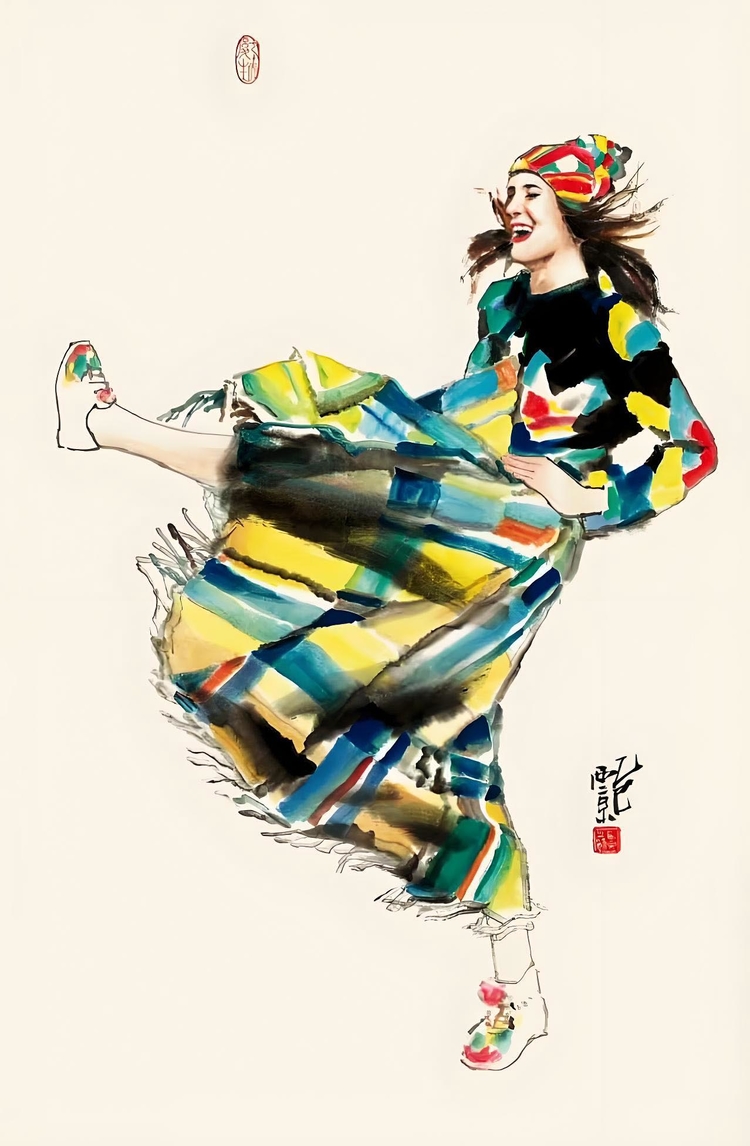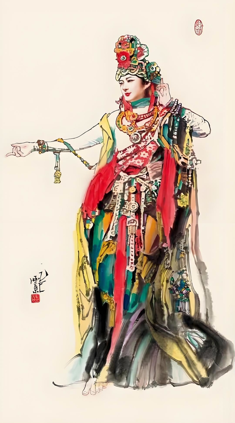 从国际文化传播的角度看,王西京云裳系列作品是中国水墨以“世界语”的姿态走向全球审美的一次实践。当水墨的笔触描摹异域服饰,西方观众能通过自己熟悉的服装符号,自然走进中国水墨的艺术语境里,读懂中国画,领略服饰文化与中国水墨表形达意的特质;而中国观众则能在水墨的文化基因中,理解不同民族服饰和生活艺术的审美价值。