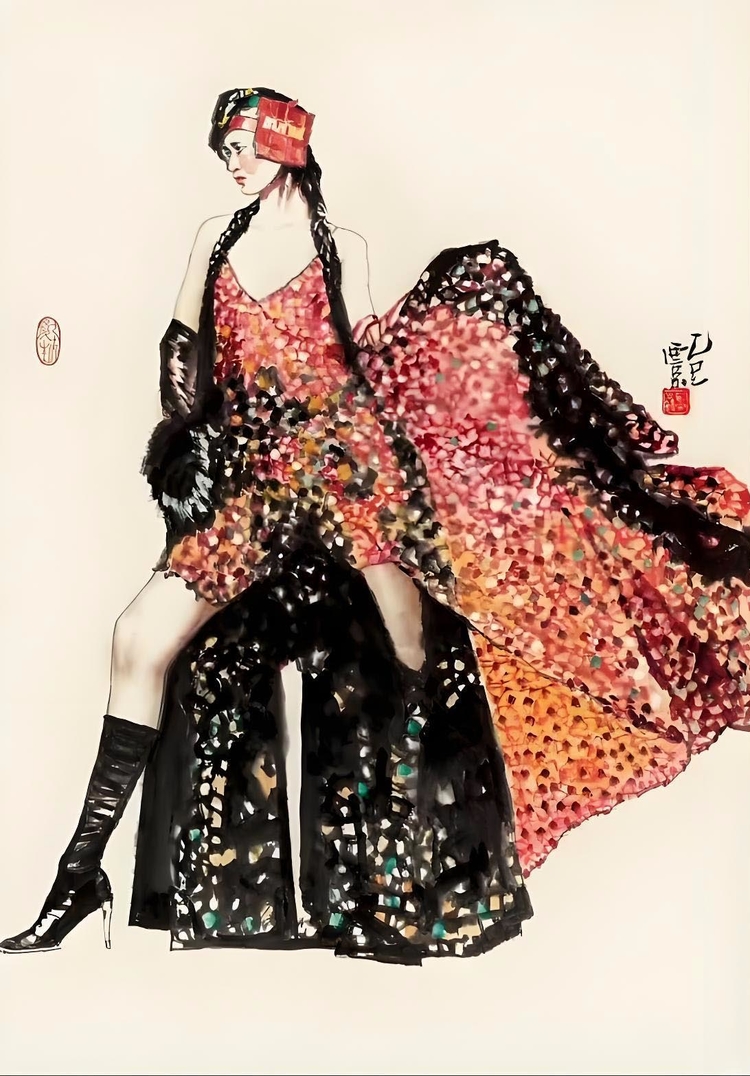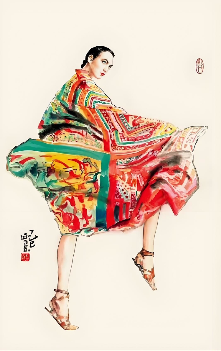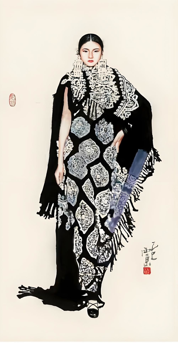 王西京云裳系列作品,是一场水墨与服装的跨时空舞会。他以中国笔墨为针线,将世界各民族的服饰风华缝入宣纸,在传统与现代的交织、民族与世界的对话中,不仅展现了服装艺术的无界之美,更让中国水墨在当代艺术的舞台上,绽放出兼具文化深度与审美广度的独特光芒。