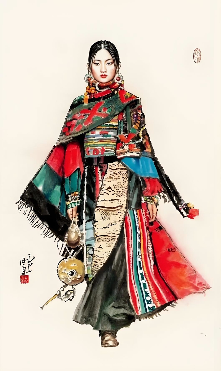 在王西京的笔下,无论是民族服饰的传统符号,还是现代服装的创新设计,都被水墨的语言赋予了新的生命维度——线条的疾徐、墨色的浓淡、设色的冷暖,不再仅仅是技法的呈现,更是服饰背后文化 精神的水墨转译。