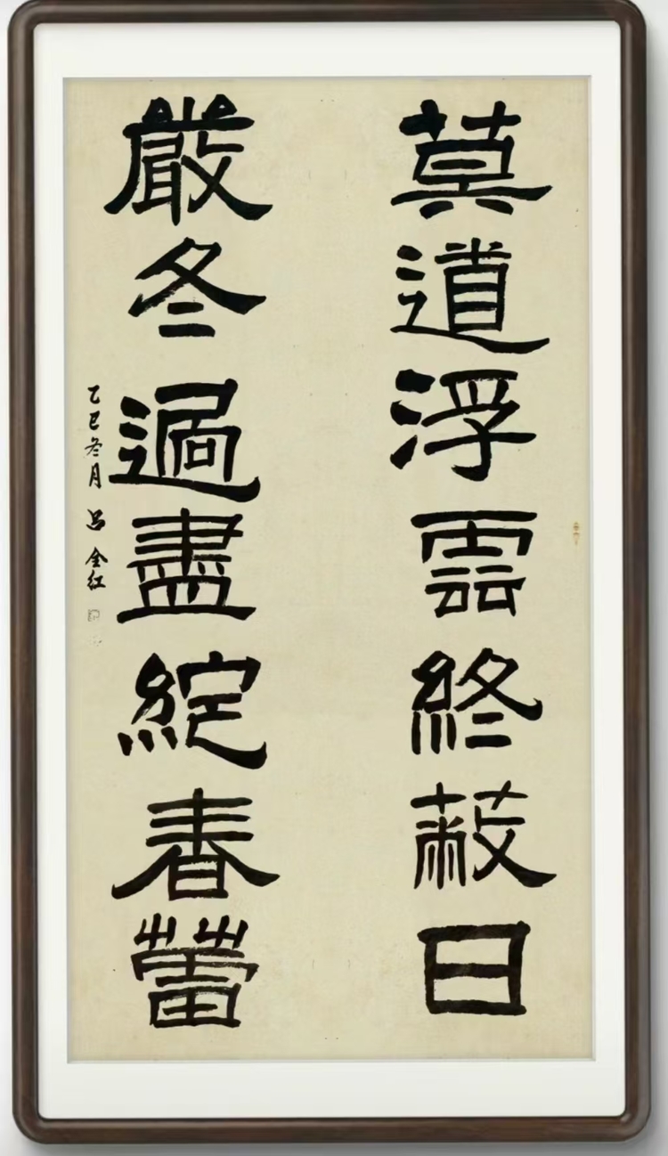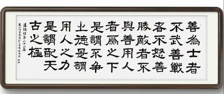 从书法作品表现形式上看,吕老师最擅以隶书风格示人,兼修行草篆书等,可谓各体皆能。提到隶书,世人常谓隶书宜作匾额之用,以为其形态扁阔,最合匾额之需。然细品隶书之神韵,方知其妙处远非“匾”之一字所能尽述。观其挑拔平硬,笔锋如折刀头,此乃汉隶之真体,古拙方劲,力透纸背。每一笔,每一划,皆似斩钉截铁,干净利落,无丝毫拖泥带水之态。隶书之美,在于其骨力遒劲,在于其气韵生动,更在于那份历经千年而不衰的古朴与厚重。故言隶书,不可仅言其形,更当悟其神,品其韵,方知隶书之妙,非匾额所能尽限也。之所以吕老师能在众多书法家中脱颖而出,关键在于其作品中流露出的“一缕真气”。这股真气,既是对书法艺术的深刻理解,也是个人情感的自然流露。不难看出在吕老师的笔下,隶书不再仅仅是文字的堆砌,而是成为了情感与意境的载体。他的隶书线条流畅而不失力度,结构灵动而不失稳重,整体来看呈现出一种大气盘旋、气势磅礴的艺术效果。