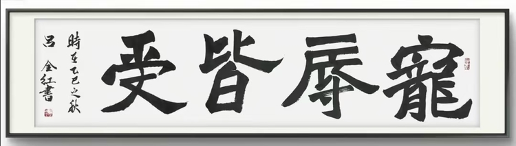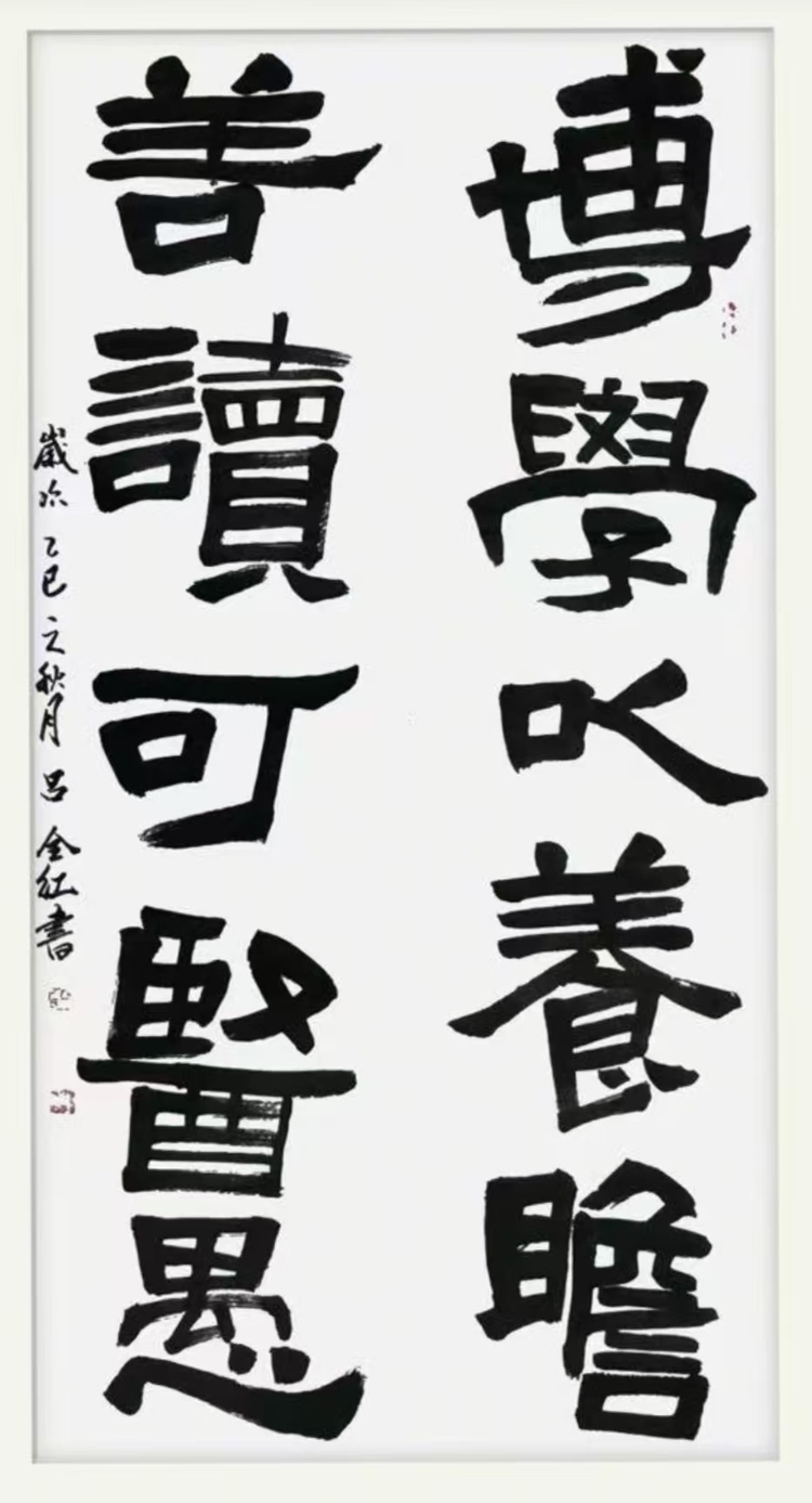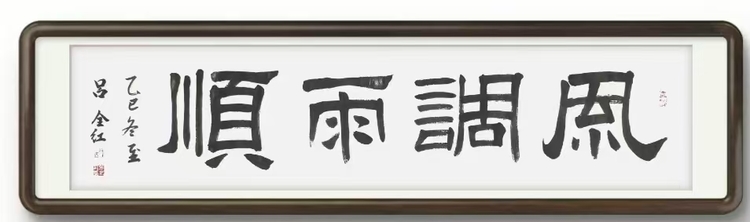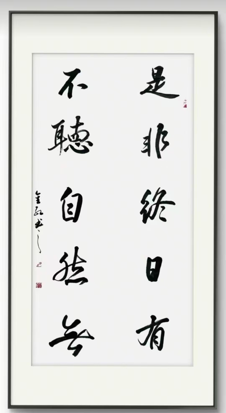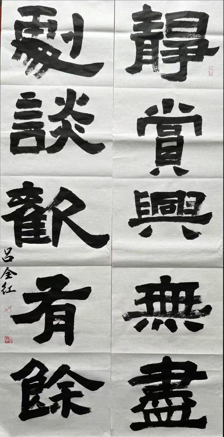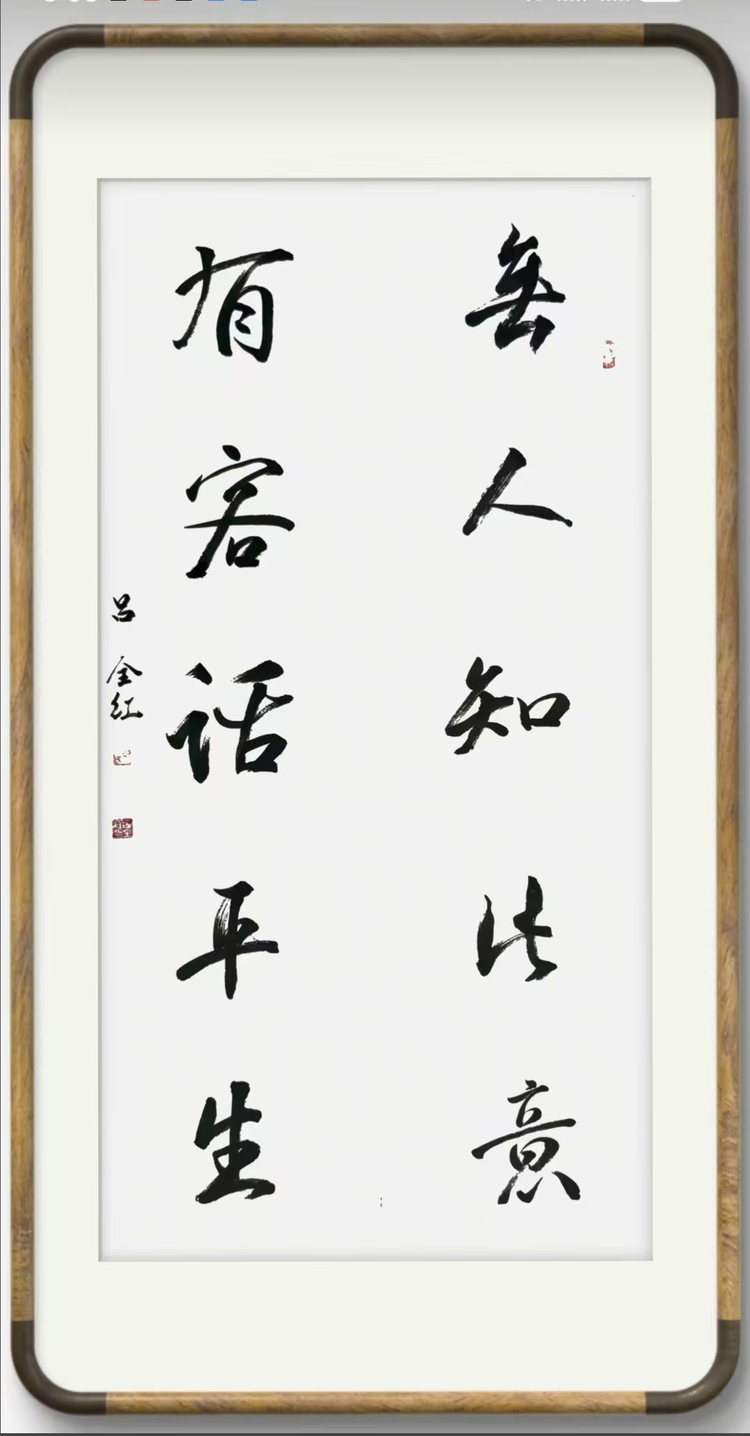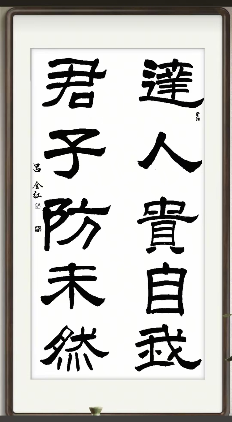 吕老师的系列书法作品,以其独特的艺术风格和深厚的文化内涵,已成为了当下中国书坛一道亮丽风景,值得我们细细品味,深深敬仰。当然人无完人,艺无止境,笔者以为吕老师作品也有不足之处,比如某些字的结体显得过于紧凑,个别字的结构又略显夸张,线条的起伏变化有的还要更严谨些,同时有的作品落款字的大小与正文也稍显不协调。刍荛之见,以供各位方家商榷。然而,即便如此,这些小瑕疵并未掩盖住其整体的艺术价值。在未来的日子里,愿我们都能像吕老师那样,继承传统以笔为舟,以墨为海勤修苦练,也去书法的海洋中遨游一番,为国家2035年文化复兴贡献一分力量。