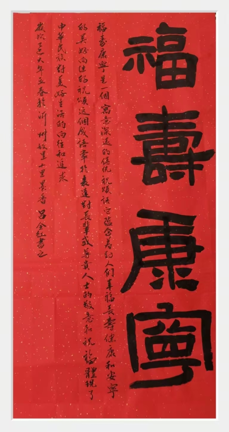 吕全红:中共党员,山东临沂人,现为中国书法家协会会员,中央美术学院、中国美术学院客座教授、中国翰墨书画研究委员会副主任。其自幼酷爱书法,精研楷书、魏碑、榜书、行草等,尤以独到隶书见长,遍临《曹全碑》、《张迁碑》《礼器碑》及诸书体,数十载笔耕不缀,法古出新,在当代书法界颇具影响力。